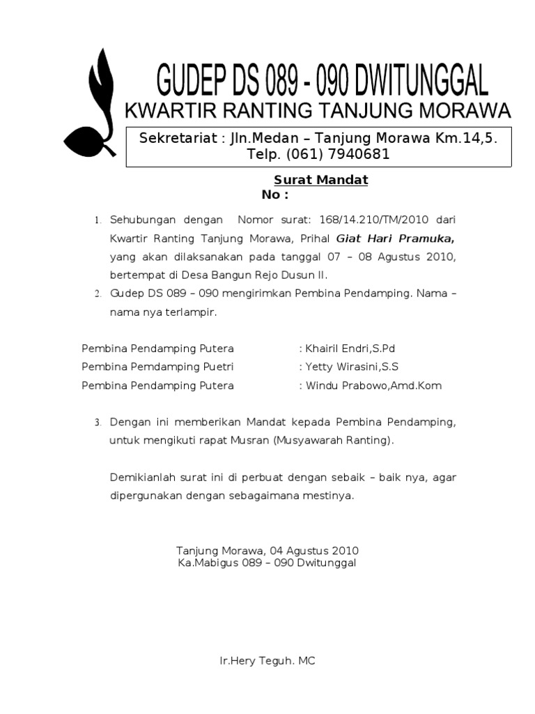 Contoh Surat Mandat Pramuka Dari Kwarran Id Lif Co Id from elearning.unsika.ac.id Pasti kamu sedang browsing d google contoh surat lamaran kerja kan ? Download contoh surat undangan resmi (doc). Share & embed contoh surat mandat ipnu. Tanda tangan dan stempel, pada bagian inilah yang membedakan antara surat resmi dan tidak resmi, pada surat resmi kamu harus bubuhkan tanda tangan dan stempel organisasi atau lembaga. Download contoh surat mandat dengan mengklik link berikut Ini hanyalah salah satu contoh surat mandat saksi untuk pemilu untuk calon dpd. Tanggal surat tanggal surat tentunya juga sangat penting dalam penulisan lamaran kerja karena akan mengetahui surat tersebut kapan dibuat. Previous post contoh surat usulan pejabat keuangan.